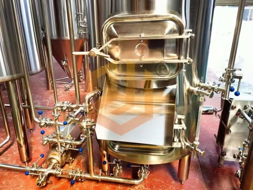 精釀啤酒設備使用的過濾槽與旋沉罐:采用上下兩層的設計方式,整體占地面積小,過濾槽采用銑制篩板,頂部采用異型人孔設計,側(cè)面配有出糟口,方形人孔門設計更有利于啤酒麥糟的清理工作,同時還配有出糟板。內(nèi)部配有耕刀裝置,用于疏松麥糟層以及出糟使用。